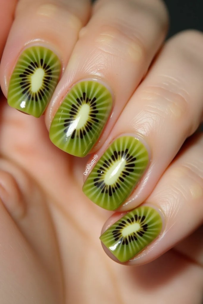 Showcase your artistic skills with tiny kiwi slices featuring the characteristic green flesh, white center, and black seeds arranged in a circle. These require patience but create stunning focal points.
